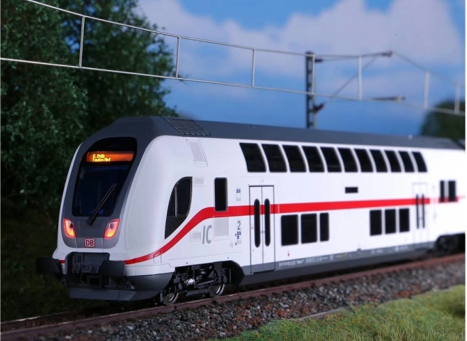 Detailně zpracovaný řídicí dvoupodlažní vůz IC2 2. třídy pro měřítko H0 s nátěrem a potiskem DB AG. Nabízí bílé/červené LED osvětlení se směrovým přepínáním, je připraven pro ovládací dekodér a je ideální pro ucelené soupravy IC2 s lokomotivami BR 146.5 nebo 147.5.