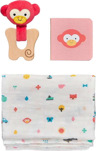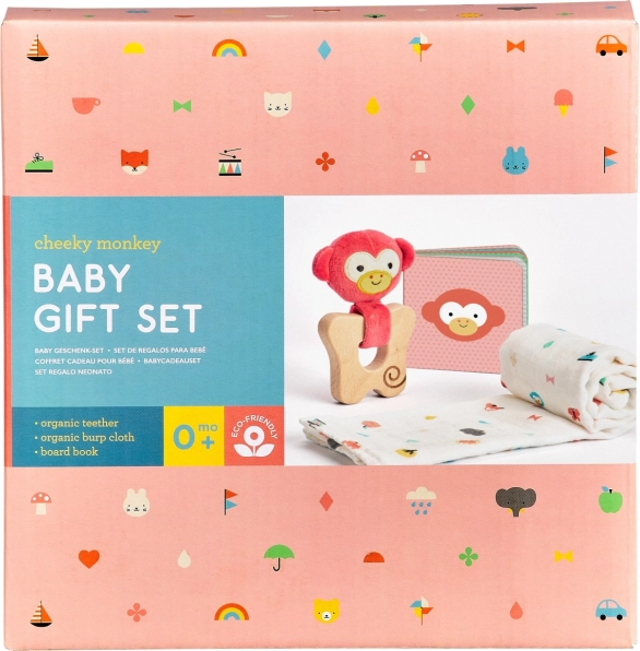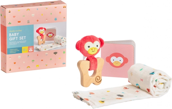 Stylový dárkový set pro novorozence s motivem opičky od PETIT COLLAGE potěší praktickými doplňky a ohleduplností k přírodě. Obsahuje kousátko z FSC bukového dřeva, měkký šátek z organické bavlny a lepenkovou obrázkovou knížku. Balení je zcela bez plastů a materiály pocházejí z udržitelných zdrojů.