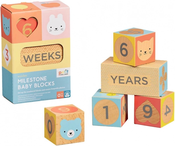 Uchovávejte vzpomínky na každý milník s milníkovými kostkami Petit Collage. Díky různým potiskům na každé straně snadno sestavíte datum, věk nebo zprávu a vytvoříte tak krásné, sdílením vhodné fotografie. Přírodní provedení z FSC bukového dřeva je šetrné k přírodě a bezpečné pro děti od narození.