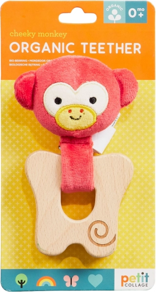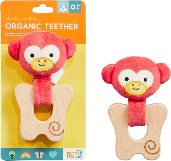 Roztomilé kousátko Petit Collage ve tvaru opičky kombinuje měkkou organickou bavlnu a pevné FSC bukové dřevo pro bezpečné a uklidňující žužlání. Díky snadnému uchopení pro malé ruce je ideální od narození a pomáhá při růstu prvních zoubků. Vyrobeno s ohledem na přírodu – bez plastového balení a s výplní z recyklovaných materiálů.