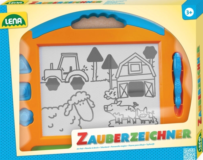 Barevná magnetická kreslicí tabulka o délce 41 cm rozvíjí dětskou fantazii a jemnou motoriku. Obsahuje stylus s kovovým hrotem, 3 magnetická razítka a posuvnou lištu pro rychlé mazání. Děti mohou snadno kreslit, razítkovat a znovu mazat bez papíru, vše bezpečně a pohodlně díky pevně připojené tužce na šňůrce.