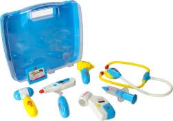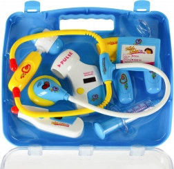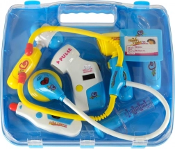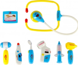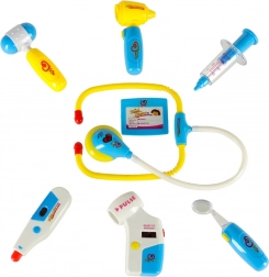 Součástí sady jsou lékařské nástroje jako stetoskop, teploměr, tlakoměr, nástroj na uši, stříkačka, kladívko, lékařský odznak a nástroj na kontrolu krku s osvětlením.