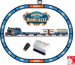 Tato kompletní železniční sada obsahuje vše pro okamžité ježdění: parní lokomotivu, osobní vůz, krytý a otevřený nákladní vůz, ovál kolejí s podložím a napájení s bezdrátovým analogovým ovladačem. Vlak v atraktivním designu RONCALLI potěší realistickým vzhledem a spolehlivým chodem.