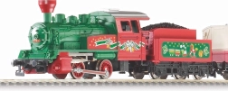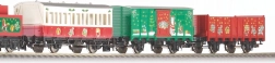 Parní lokomotiva 0-4-0 s tendrem, osobní vůz a dva nákladní vozy v jednotném svátečním designu. Perfektní pro okamžité rozjetí atmosféry.