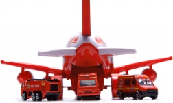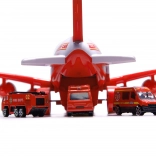 Letadlo–transportér hasiči se 3 auty a dopravními značkami