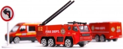 Součástí sady jsou 3 červená vozidla: hasičský vůz s žebříkem, obrněný transportér a městské zásahové auto + 7 dopravních značek. Praktické madlo na horní části usnadňuje přenášení i otevírání.