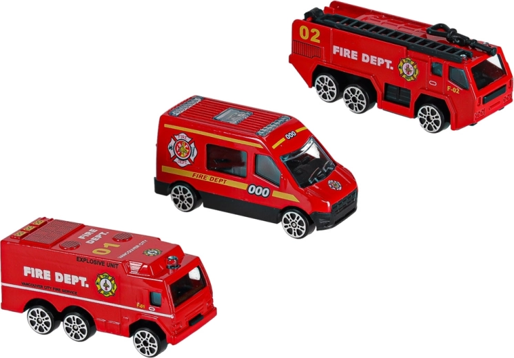 - 3 červená hasičská auta: žebříkový vůz, obrněný transportér, městský vůz
