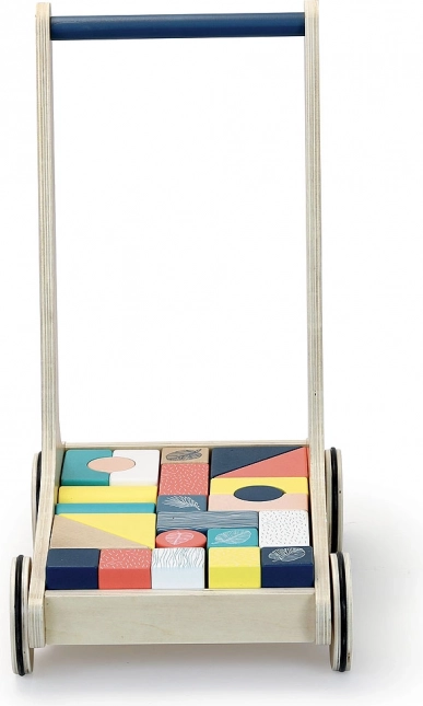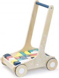 24 kostek různých tvarů je obsaženo ve vozíku, což dětem poskytuje nespočet možností pro tvořivou hru. Vozík má moderní design s modrým madlem a bílými ilustracemi.