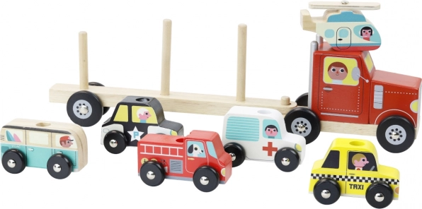 Barevná dřevěná sada s kamionem a přívěsem přináší hodiny kreativní zábavy pro děti od 2 let. Na dlouhý přívěs lze nasadit 6 vozidel – taxi, policejní auto, hasičské auto, sanitku, helikoptéru a minibus. Hračka je z kvalitního dřeva a kovu, má hladké zpracování a podporuje jemnou motoriku, koordinaci ruka–oko i fantazii. Design vytvořila renomovaná ilustrátorka Ingela P. Arrhenius.
