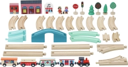 - 40 dílů: lokomotiva, 4 vagóny, 24 dílků kolejí, stanice, domy, stromy, dopravní značky