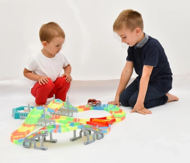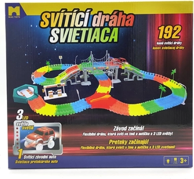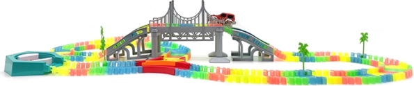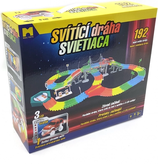 Postavte si vlastní závodní okruh z 192 barevných dílků a užijte si jízdu s LED autíčkem, které prosvítí každou zatáčku. Díly jsou flexibilní a snadno se zacvakávají, takže děti mohou rychle měnit tvar i délku tratě a experimentovat s mosty, zatáčkami i klesáním.