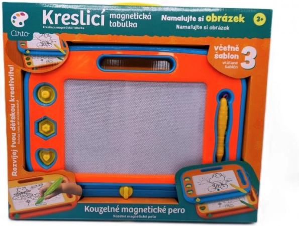 Magnetická kreslicí tabulka s magnetickým perem a 3 razítky. Tvoření bez nepořádku, snadné mazání a rozvoj kreativity dětí. Různé barevné varianty.