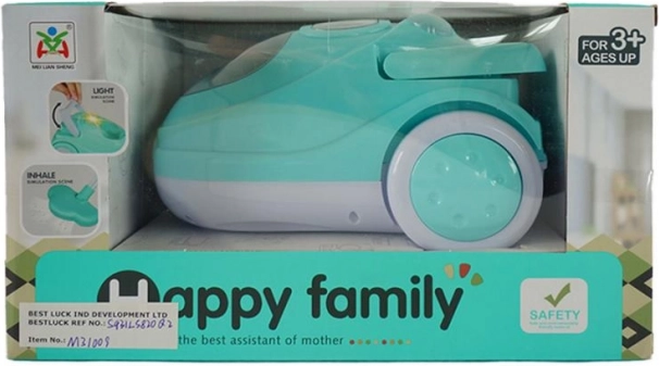 Vysavač v moderní barve, který svítí a má sací simulaci. Velikost 28x17x16 cm.