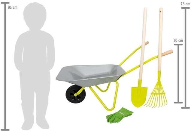 - Praktické rozměry: kolečko cca 79 × 36 × 50 cm, výška rukojetí 50 cm; délka lopaty a hrábí cca 73 cm.