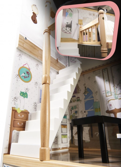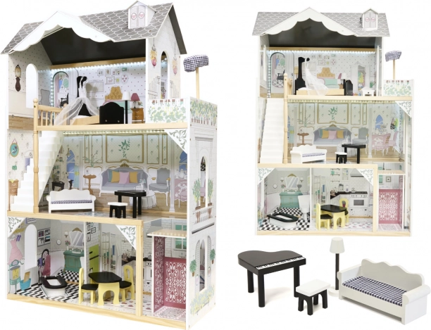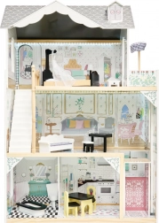 Dřevěný domeček pro panenky se vyznačuje moderním stylem a splní sny každého dítěte. Obsahuje 4 samostatné místnosti, balkon a výtah. Je plně vybaven krásným dřevěným nábytkem, který dokonale doplní každý pokoj v domečku.