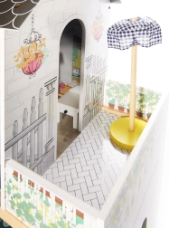 Domeček má 3 podlaží a obsahuje 4 samostatné místnosti, balkon a výtah, umožňující hrát s více panenkami.