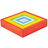 Duhová paleta a postupně se zmenšující čtverce vedou děti k rozlišování barev, velikostí a tvarů. Ideální pro první třídění a pojmenovávání.