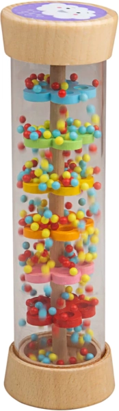 Dešťový válec Bigjigs Baby je smyslová hračka, která děti zaujme svým uklidňujícím šumem a pestrými barvami. Uvnitř průhledného válce putují kuličky přes barevné disky, čímž napodobují jemný déšť. Obě čela zdobí roztomilé motivy slunce a mráčku, které podporují vizuální vnímání.