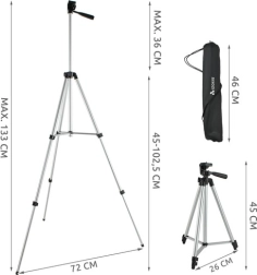 Stativ je ideální pro fotografii i videografii za použití fotoaparátu, telefonu nebo digitální kamery. Disponuje univerzálním závitem 1/4" a kompatibilním držákem pro různé zařízení. Tento praktický a lehký pomocník je snadno přenosný, což ho činí ideálním společníkem na cestách.
