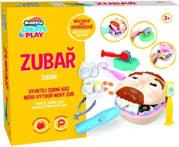 Kreativní sada Modelo Zubař: vymodelujte zuby, vyvrtejte kaz, nasaďte rovnátka. Modelína nebarví a nevysychá. Podporuje jemnou motoriku a kreativitu.