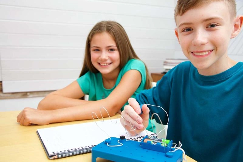 Díky jednoduše sestavitelným dílům si děti osvojí základní principy elektřiny – když se kroužek dotkne vodiče, obvod se uzavře a bzučák se ozve.