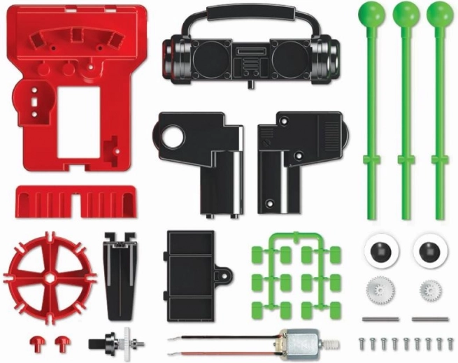 Sada obsahuje barevné plastové díly a zelené tyče, které se sestaví do robota schopného hrát na bubny. Proces montáže podporuje logické myšlení a manuální zručnost, což je skvělý způsob, jak spojit zábavu s učením.