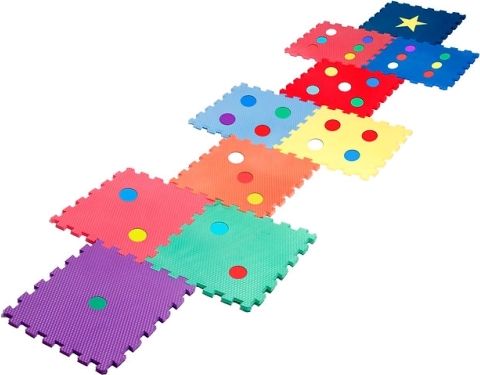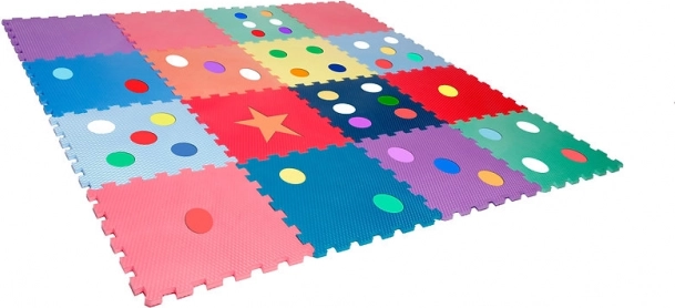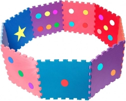Živé barvy a tvary (puntíky, hvězda) podporují smyslové vnímání a rozvoj jemné i hrubé motoriky. Pěna tlumí nárazy a chrání před chladem podlahy.