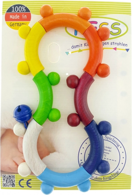 Tato kvalitní dřevěná hračka je navržená pro nejmenší děti od narození. Díky příjemnému tvaru a povrchům přirozeně podněcuje úchop, trénuje koordinaci oko–ruka a rozvíjí jemnou motoriku. Vizuálně přitažlivé barvy a chrasticí prvky lákají k objevování a hře.