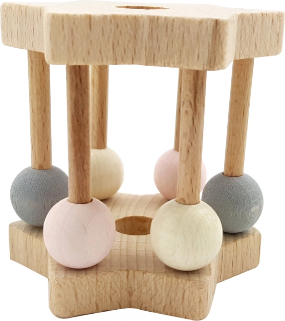 Moderní dřevěné chrastítko ve tvaru růžové hvězdičky je ideální hračkou pro rozvoj motorických schopností vašeho dítěte. Je vyrobeno z kvalitního bukového dřeva, což zajišťuje jeho dlouhou životnost a bezpečnost.