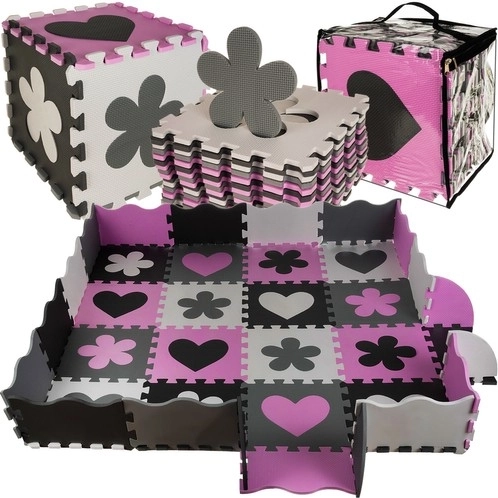 Podložku lze sestavit na plocho (cca 140 × 140 cm) nebo vytvořit ohrádku s pomocí bočních lišt a rohů. Materiál EVA je voděodolný a snadno se čistí – stačí otřít vlhkým hadříkem. Sada je dodávána v praktickém přenosném pouzdře, takže ji snadno vezmete na návštěvu nebo uklidíte, když se zrovna nepoužívá.