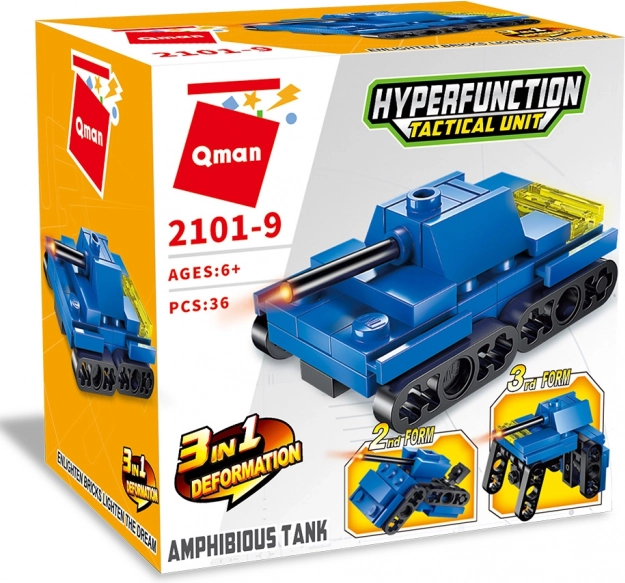 Stavebnice Tank Qman 3v1 nabízí trojici možností sestavení z pestrých plastových kostiček, které lze kombinovat s podobnými stavebnicemi. Vyrobeno z kvalitního a odolného ABS plastu.