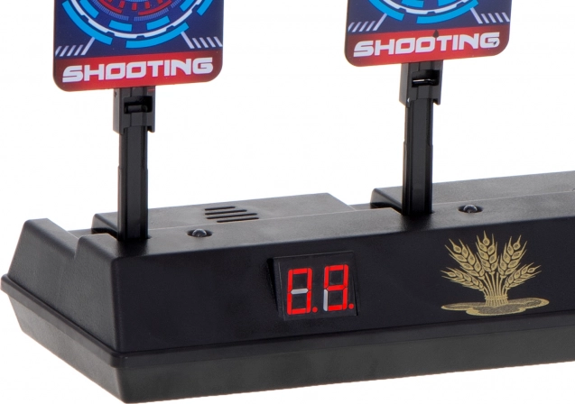 LED displej přehledně počítá body a po zasažení všech čtyř cílů se terče samy zvednou – hra plynule pokračuje bez ručního nastavování.