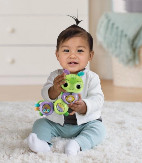 Jedno stisknutí a housenka ožije milými písničkami, veselými melodiemi a zábavnými frázemi, které podporují vnímání rytmu a řeči.