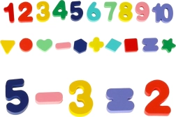 Děti přiřazují barevné tvary a číslice do správných pozic, čímž trénují zrakové rozlišování, logiku a slovní zásobu (barvy, tvary, čísla).