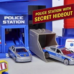 Na střeše najdete heliport, v setu je policejní stanice se skrytou skrýší, stanoviště hasičů, myčka, čerpačka se světly a zvuky, stanice vlaku a tajný tunel s přejezdem. Spirální výtah na baterie vyveze auta na libovolné patro a z ramp se závorami se řítí zpět dolů – ideální kombinace akce a dovedností.