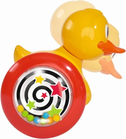 Kachnička ve veselých barvách při pohybu vpřed hýbe hlavou a zároveň chrastí malými kuličkami, které jsou umístěny v kolečkách.