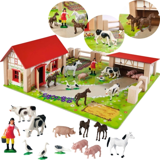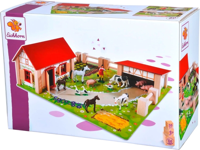 Objevte kouzlo venkova s dětskou dřevěnou farmou EICHHORN – kompletní herní set s domečkem, stájí, ohradami a 12 realistickými figurkami zvířat. Nabízí pevné dřevěné zpracování, barevnou herní podložku a bohaté příslušenství pro kreativní hraní a rozvoj fantazie. Ideální pro děti od 3 let, které milují zvířátka a role-play pečování o farmu.