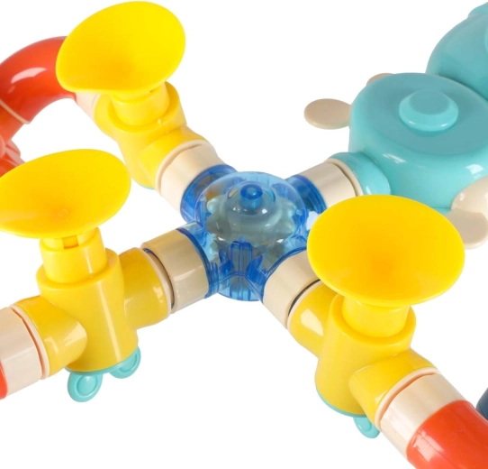 Zábavná koupací stavebnice s trubkami a mořskými zvířátky promění každé koupání v kreativní hru. Nalijte vodu do horního trychtýře a sledujte, jak proudí trubkami, roztáčí kolečka a vytváří vodopády a fontánky. Díky přísavkám hračku snadno připevníte na vanu či obklady. Rozvíjí jemnou motoriku, učení příčiny a následku a podporuje kreativitu při stavění vlastních vodních tras.