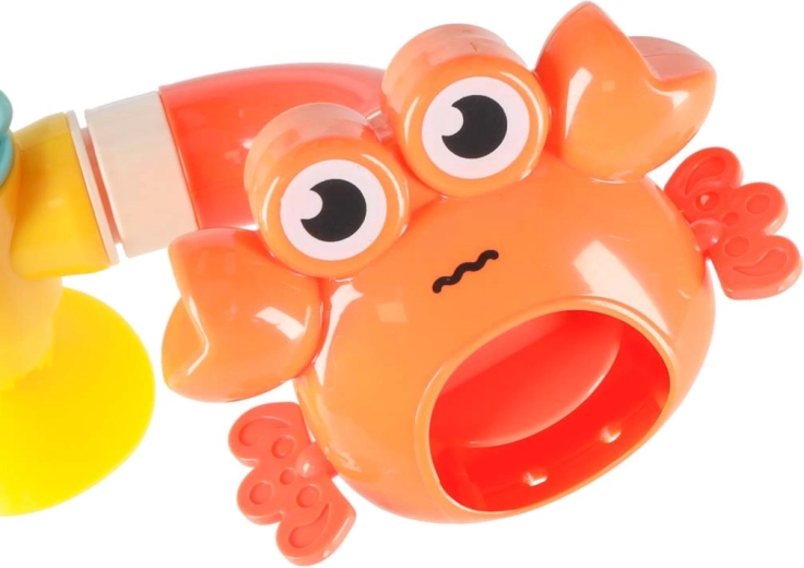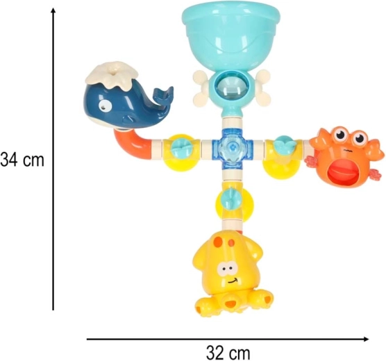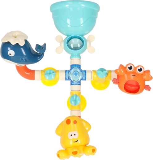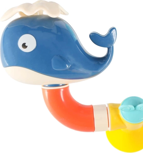 Tato barevná vodní dráha do vany se skládá z trychtýřů, trubek a veselých vývodů ve tvaru velryby, kraba a chobotnice. Děti jednoduše nalijí vodu shora a sledují, jak protéká systémem, roztáčí kolečka a vytéká z různých otvorů jako fontána nebo vodopád. Bezpečné materiály a oblé hrany jsou ideální pro každodenní vodní hraní.