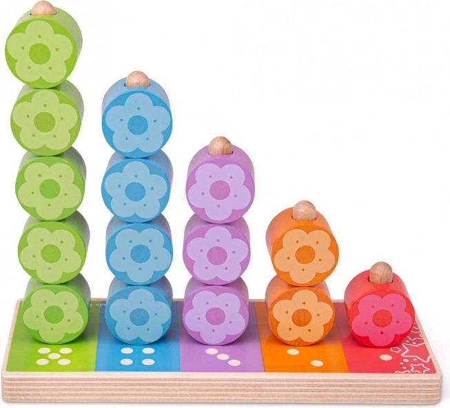 Každý sloupek má svůj počet a barvu, takže děti snadno pochopí princip párování a počtu. Květinkové dílky se pohodlně drží i malým ručkám a motivují k samostatné hře i společnému objevování s rodiči.