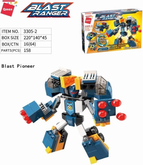 Se stavebnicí Qman Blast Ranger si děti užijí filmovou akci. Výkonné auto v sobě ukrývá robotického strážce, který je připraven chránit posádku. Díky chytré konstrukci lze model přeměnit bez nutnosti rozebírání, což přináší plynulé hraní a více příběhů.