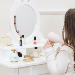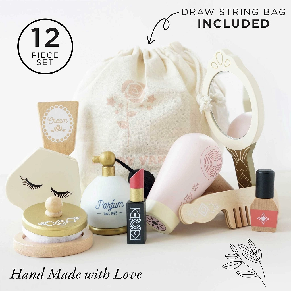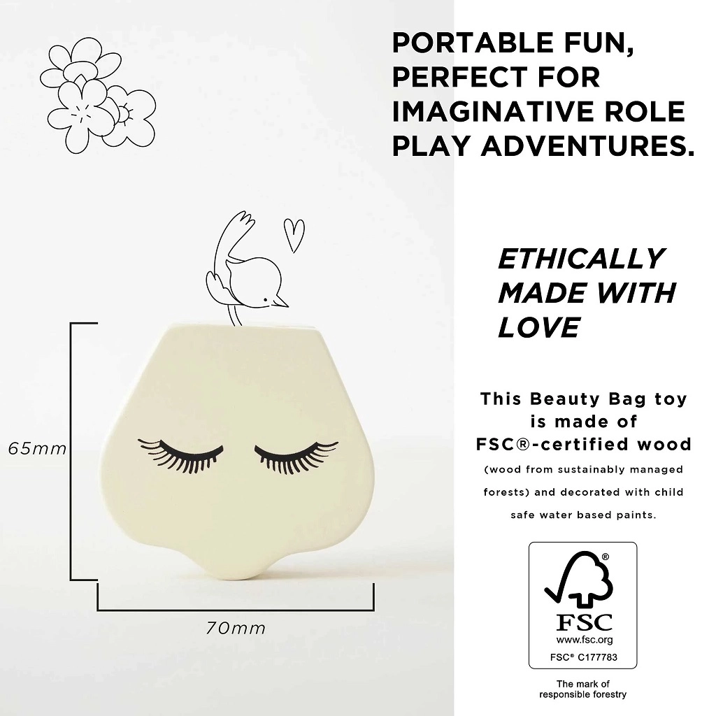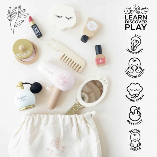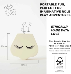Staňte se hvězdou vlastní show s touto stylovou kosmetickou taškou pro děti! Obsahuje vše potřebné pro hru na vizážistu – od krému až po fén. Vyrobena z přírodní bavlny a kvalitního dřeva s certifikací FSC®, ručně domalováno ekologickými barvami. Podporuje představivost, jemnou motoriku a hru na role.