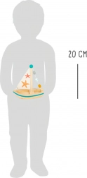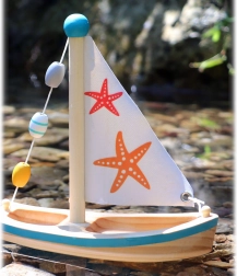 Stylová dřevěná plachetnice s potiskem hvězdic je připravena na vodní dobrodružství ve vaně, u bazénu i u moře. Má plovoucí trup, dekor dřevěných korálků a dostatek místa pro vlastní figurky. Skvělá ekologická alternativa k plastovým hračkám, vhodná od 24 měsíců. Rozměry 17 × 8,5 × 20 cm.