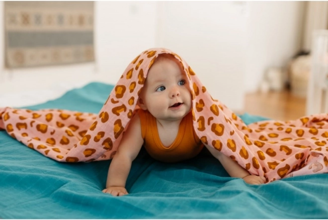 Velkorysý rozměr 120 × 120 cm nabízí desítky použití: od zavinutí, přes přikrytí v kočárku, až po bryndák či podložku. Stylový potisk leoparda v korálových tónech potěší oko a krásně ladí s dětským pokojíčkem i výbavičkou na cesty.