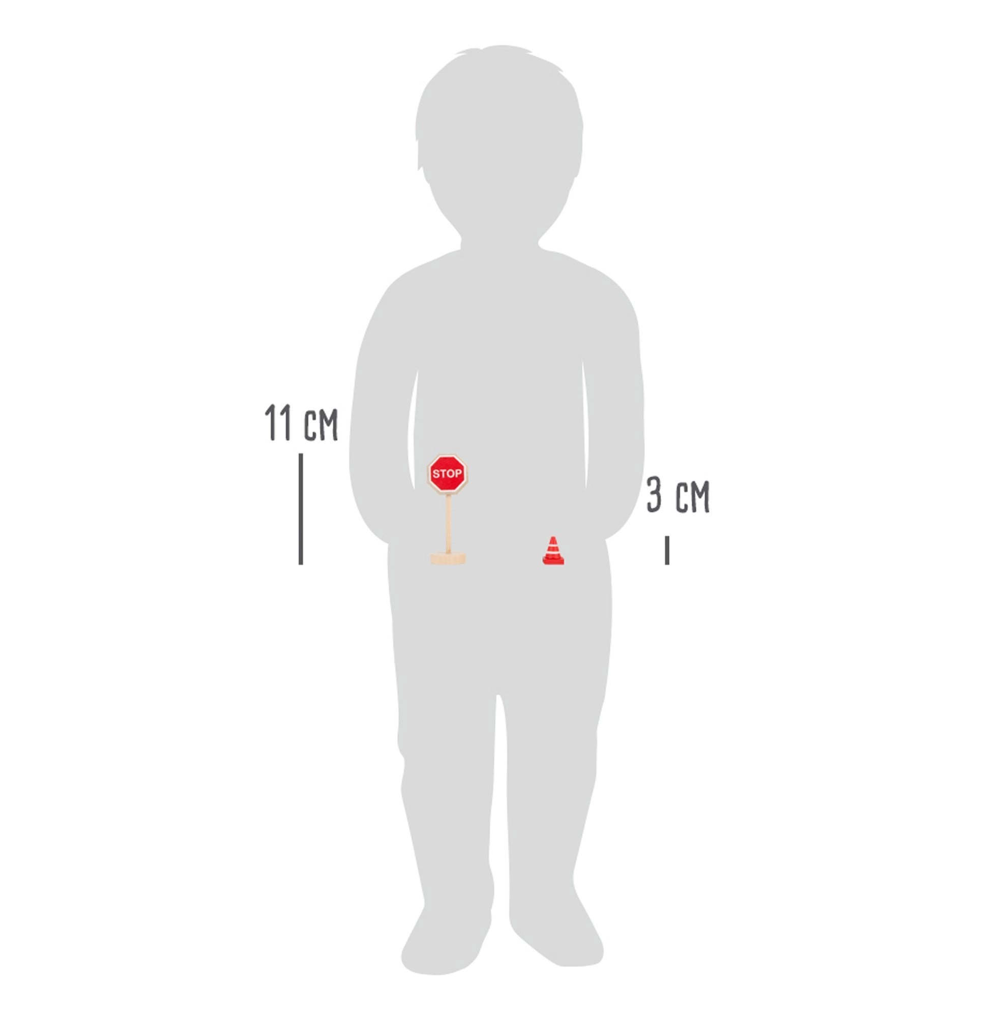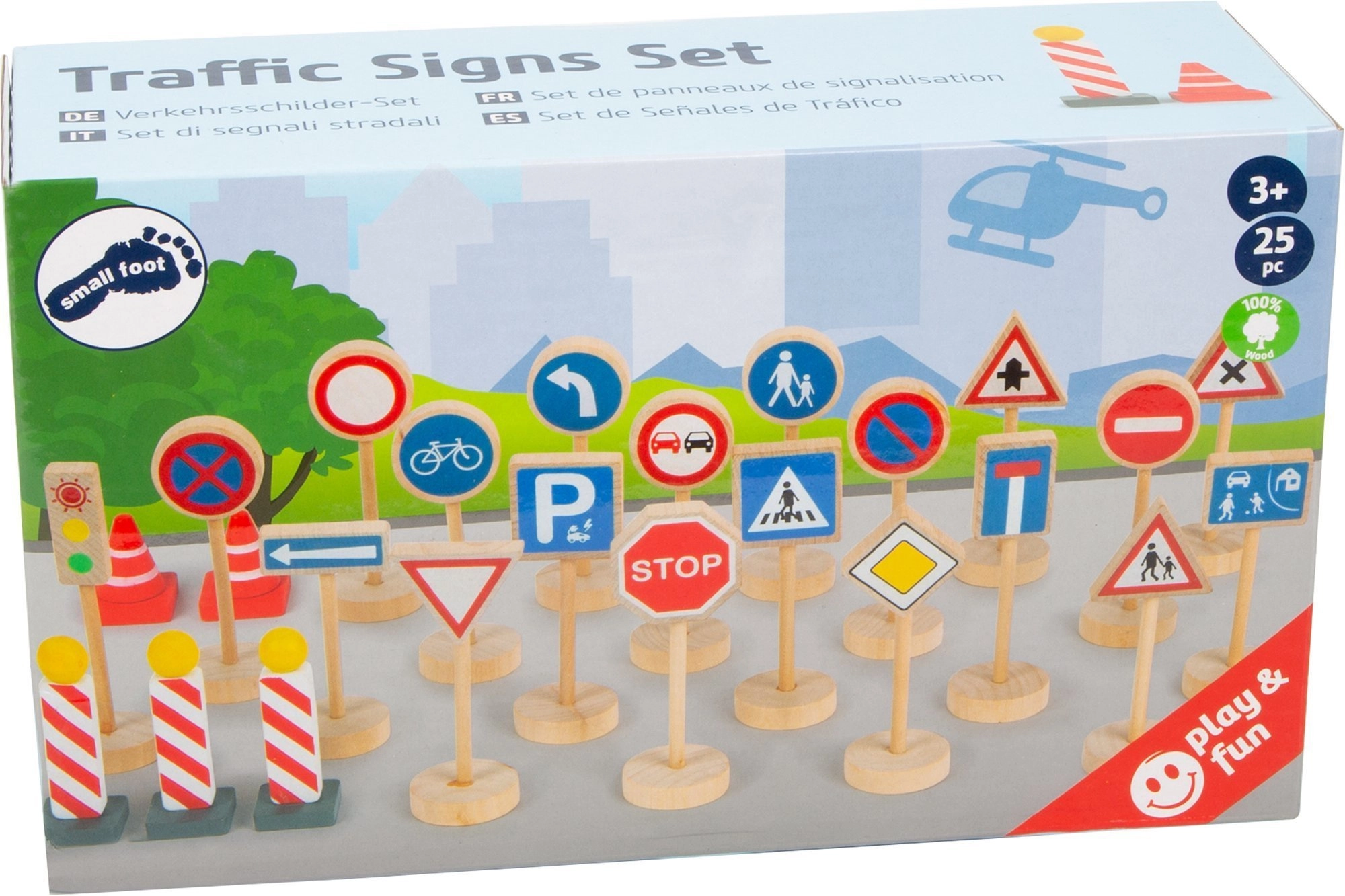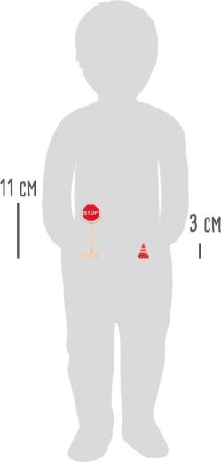 Tato kvalitní dřevěná sada přináší vše, co děti potřebují k vytvoření vlastního dopravního světa. Najdete v ní značky jako STOP, povinný směr vlevo, zákaz předjíždění, hlavní silnice, přechod pro chodce, parkoviště, a také semafor, kužely a zábrany. Díly mají výšku přibližně 3–11 cm, dobře se drží a díky stabilním podstavcům pevně stojí.