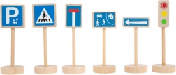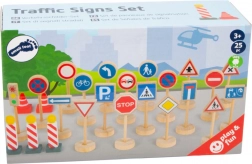 Sada 25 dřevěných dopravních značek a doplňků (např. kužely) pomáhá dětem pochopit pravidla silničního provozu v realistických herních scénářích. Díky čitelným symbolům a stabilním podstavcům se s nimi dobře manipuluje a jsou skvělým doplňkem k dopravním kobercům i vláčkodráhám.