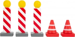 Značky jsou přibližně 11 cm vysoké, kužely kolem 3,2 cm – velikost ideální pro uchopení, stavění a tvoření vlastního dopravního světa.