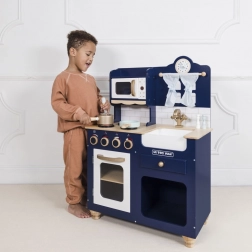 Stylová dětská kuchyňka z kvalitního dřeva v odstínu královské modři se zlatavými akcenty přináší dětem hodiny kreativní a představivé hry. Nabízí otevírací troubu, otočné knoflíky, dřez, mikrovlnku, roztomilé okénko se závěsy a hodiny s otočnými ručičkami. Součástí balení jsou dřevěné doplňky – metlička, vařečka, solnička a pepřenka. Vyrobeno eticky z udržitelného dřeva a malováno netoxickými barvami na vodní bázi.
