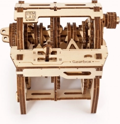 Složení modelu čtyřstupňové převodovky odhaluje chod mechaniky, kde se demonstruje řazení rychlostních stupňů, zpátečky a volnoběhu. Model je vyroben z překližky a nabízí interaktivní výuku díky rozšířené realitě přes aplikaci UGEARS. Prohloubení zážitku umožňuje QR kód, který spojíte s Vaším mobilním telefonem.