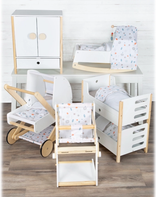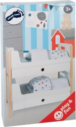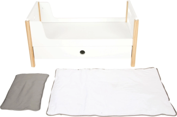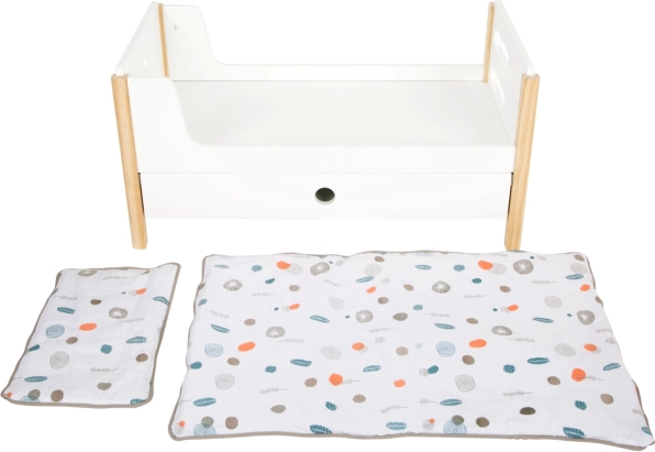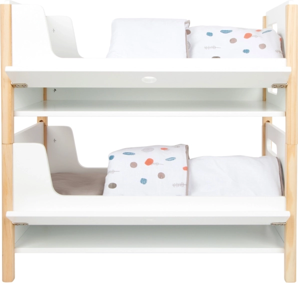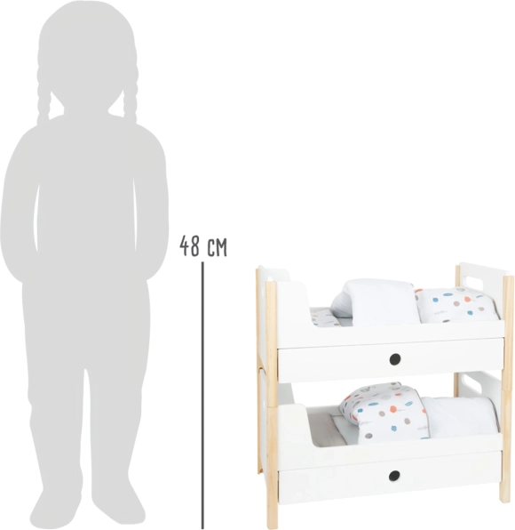 Součástí balení je povlečení v neutrálních barvách a oversized peřiny, které pohodlně ubytují panenky či plyšáky až do 46 cm. Šuplíky pod každým lůžkem nabízejí chytré úložiště pro oblečky a drobné doplňky. Ideální doplněk do dětského pokoje i do stylového koutku pro panenky v rámci kolekce Little Button.